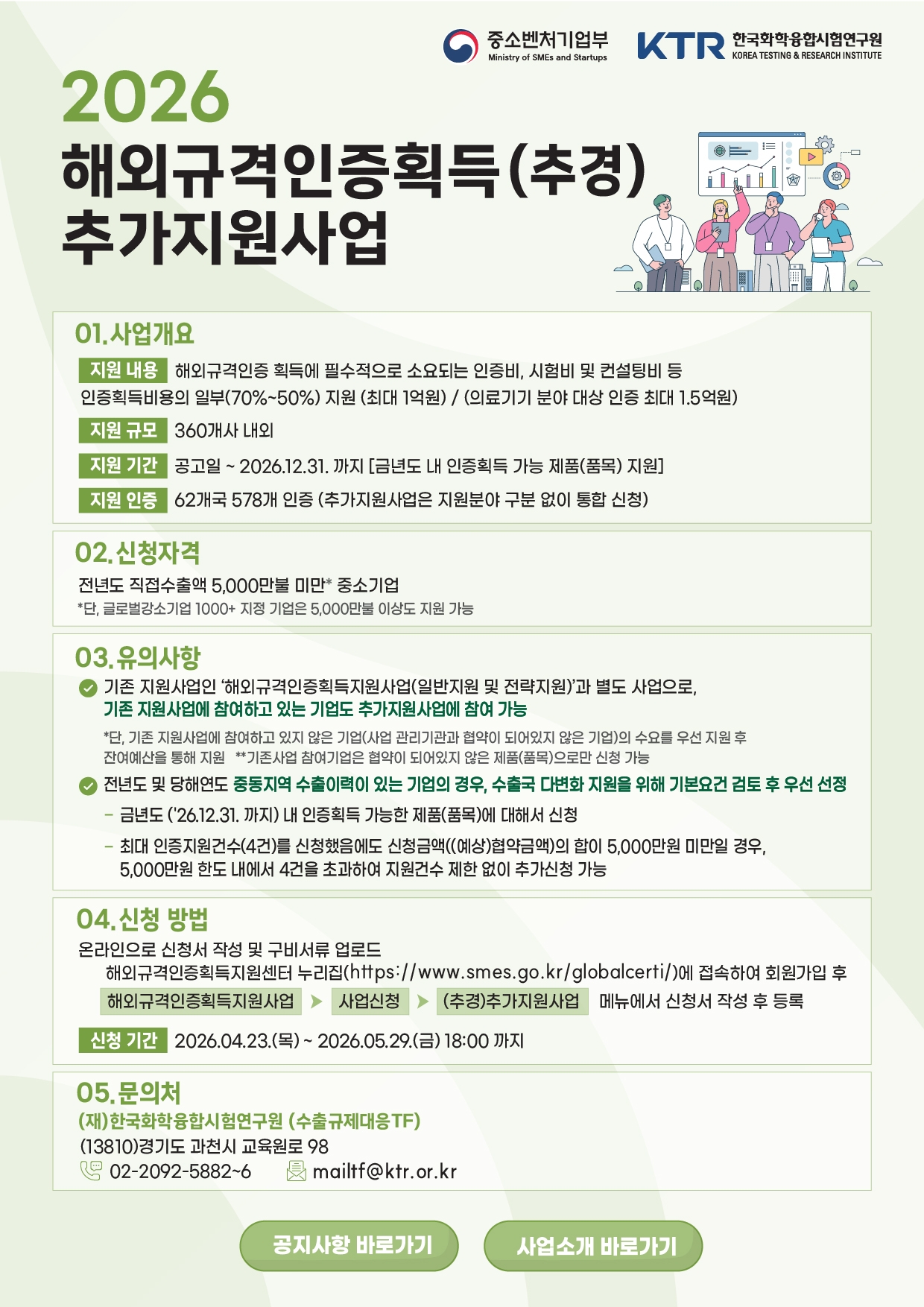 2026년 해외규격인증획득지원(추경) 추가지원사업의 참여기업을 모집합니다.